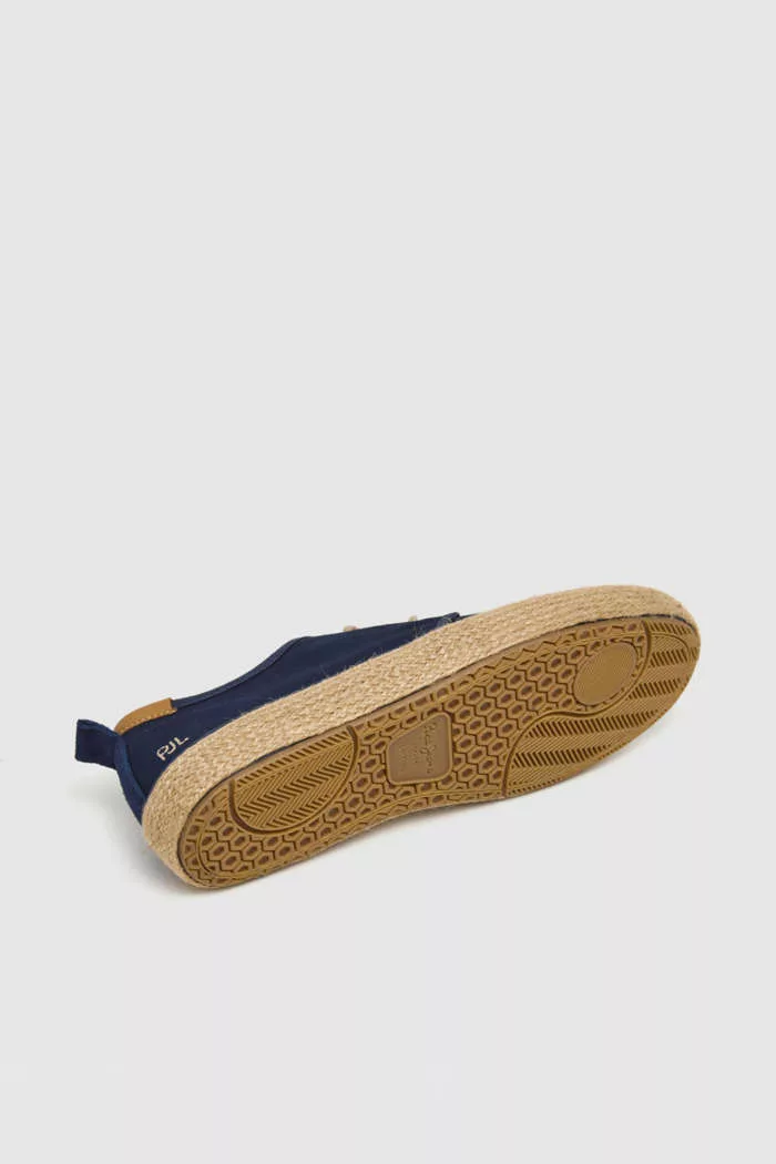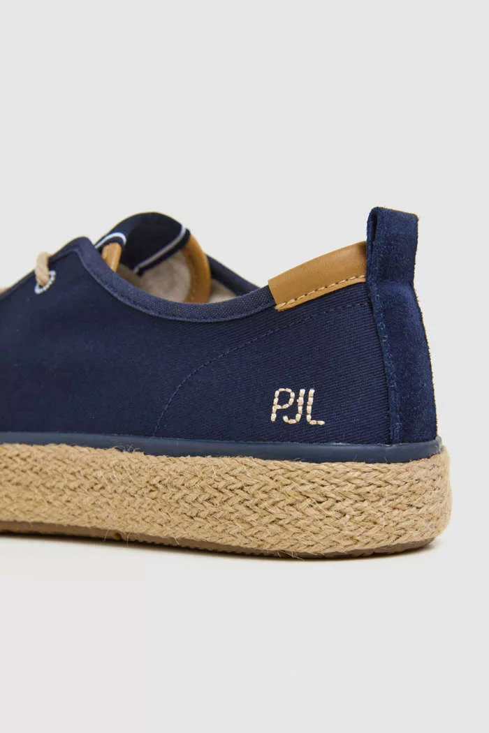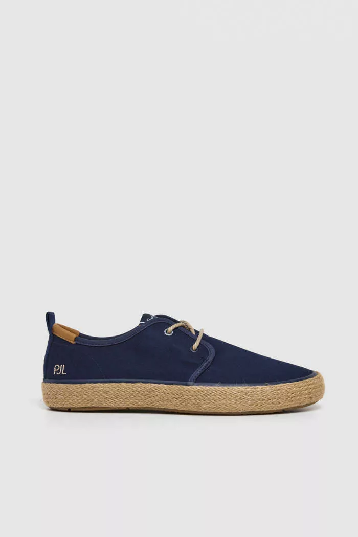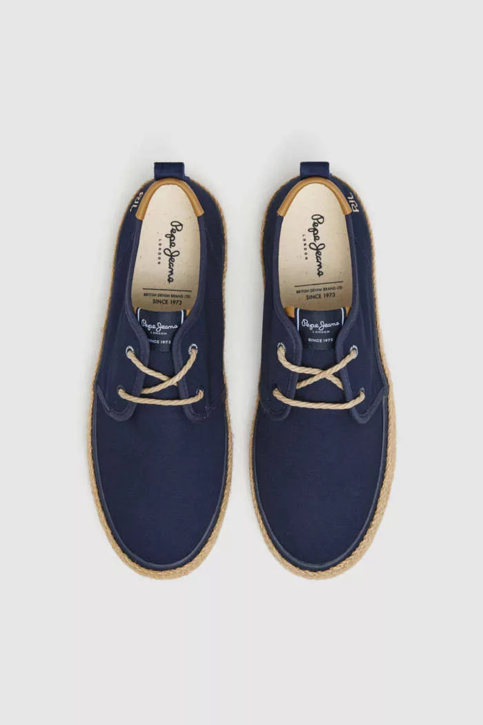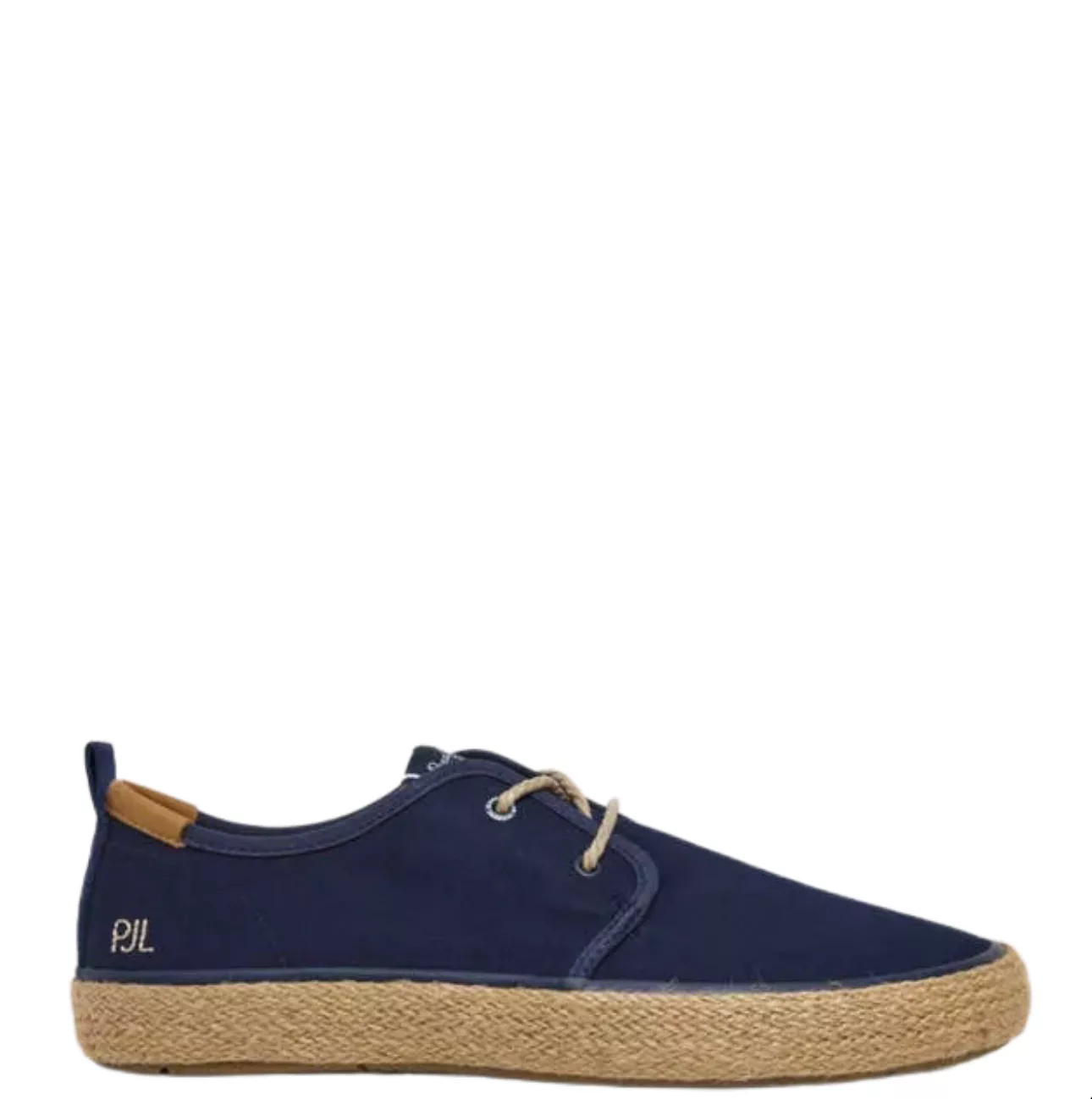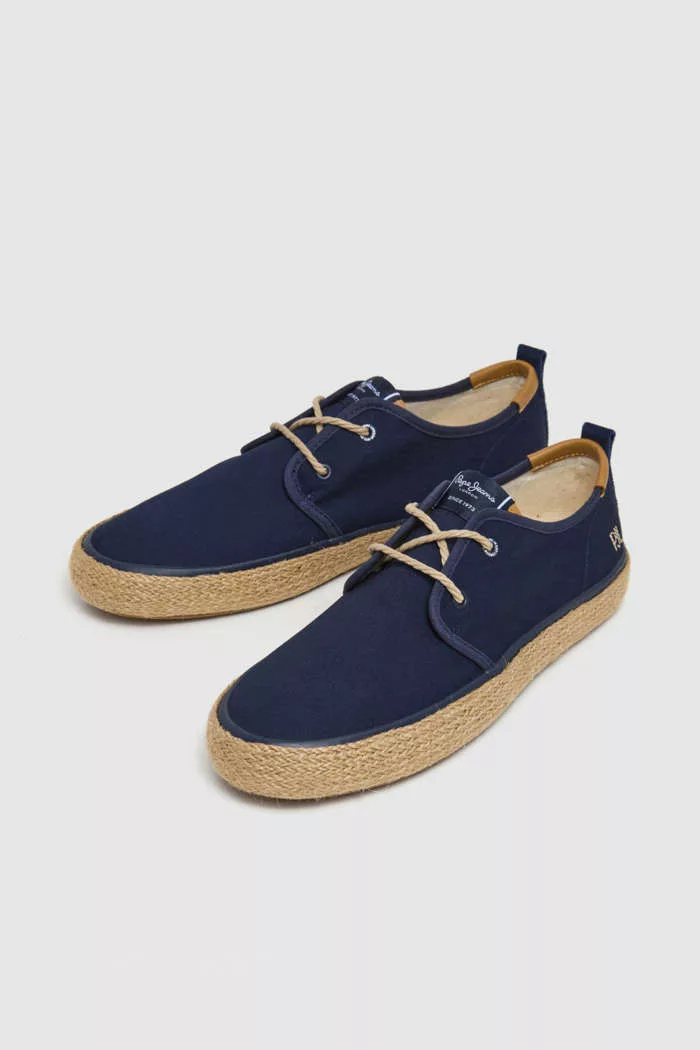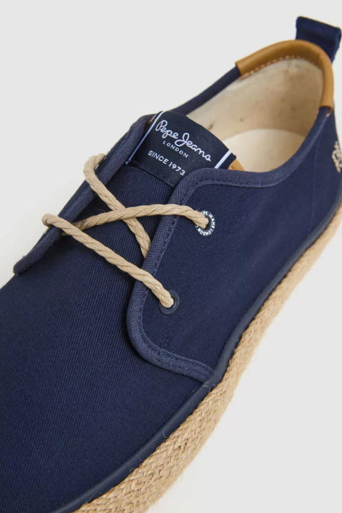 Εσπαντρίγιες Pepe Jeans, κατασκευασμένα από βαμβακερό ύφασμα, σε μπλέ χρώμα. Η σόλα είναι επενδυμένη περιμετρικά με γιούτα και υπάρχει κεντημένο λογότυπο στο πλάι.