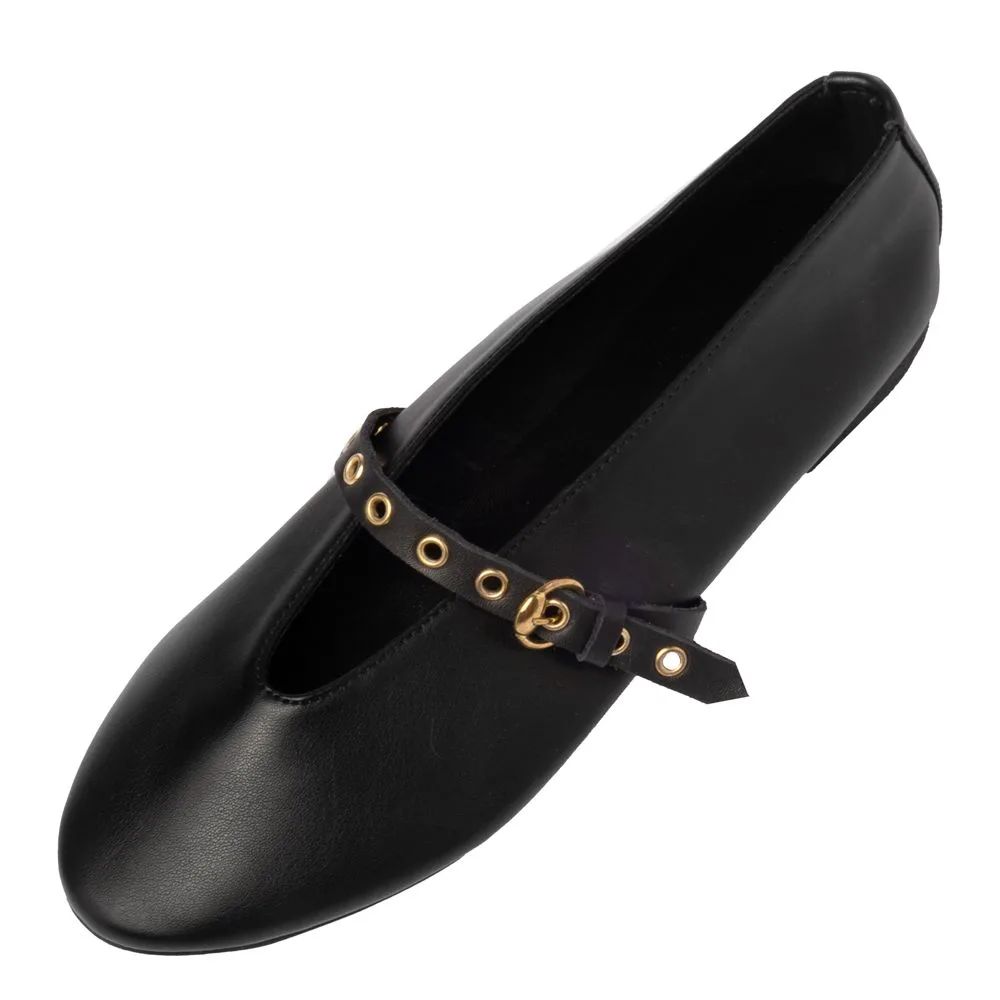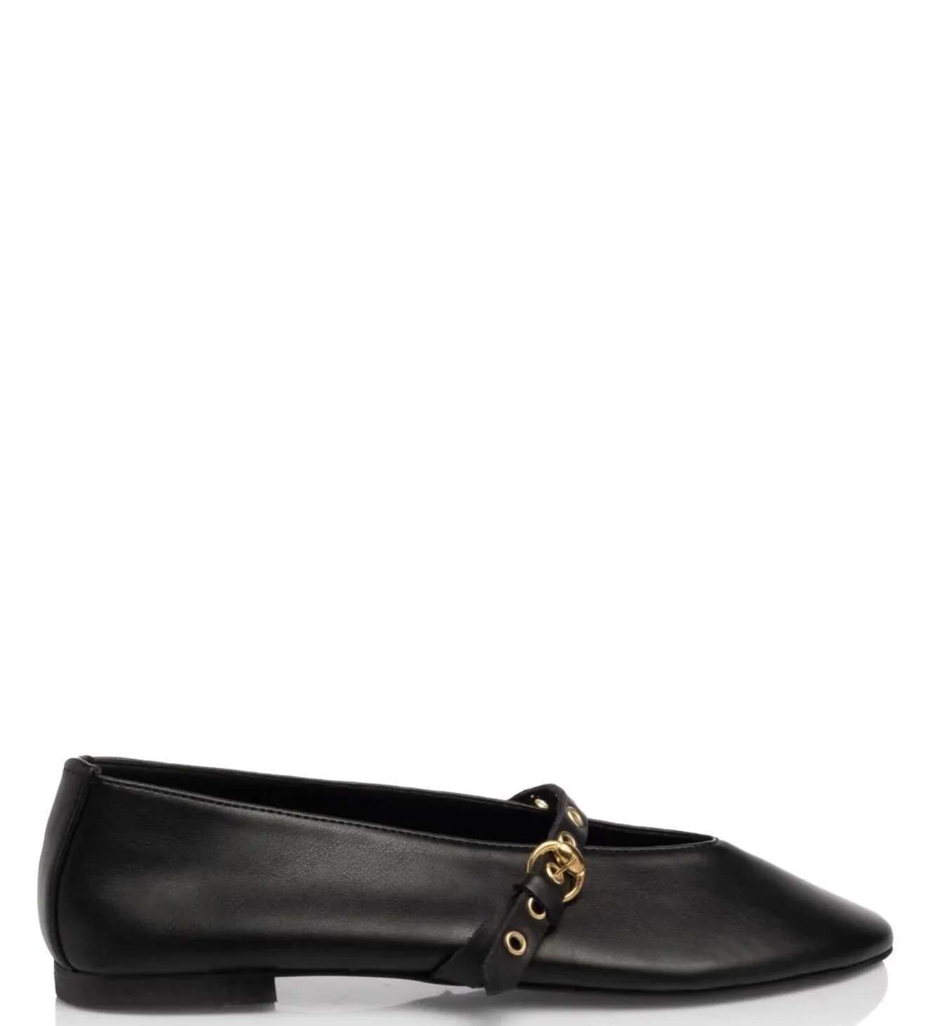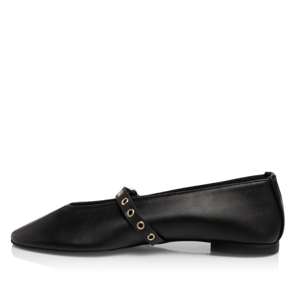 Διαθέτει minimal σχεδιασμό με διακοσμητικό λουράκι στο επάνω μέρος και μεταλλική χρυσή λεπτομέρεια που προσθέτει μια διακριτική πινελιά κομψότητας. Η χαμηλή σόλα προσφέρει σταθερότητα και άνεση στο περπάτημα, καθιστώντας την ιδανική για καθημερινή χρήση.